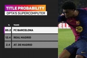 三亿体育官网-Opta预测西甲夺冠概率:巴萨85.2%、皇马12.4%、马竞2.4%